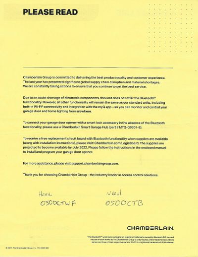 To receive a free replacement circuit board with Bluetooth functionality when supplies are available (along with installation instructions), please visit: Chamberlain.com/LogicBoard. The supplies are projected to become available by July 2022. Please follow the instructions in the enclosed manual to install and program your garage door opener .